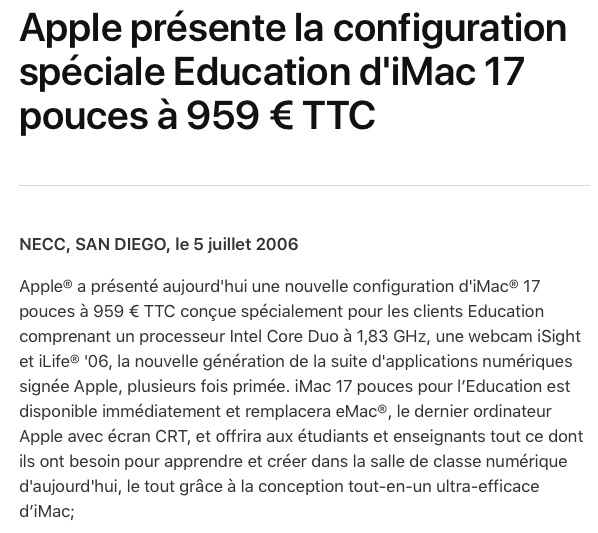 Connaissez-vous un iMac qui ne soit resté que deux mois au catalogue d’Apple ? Nous fêtons aujourd’hui son anniversaire : il s’agit de l’iMac « Mi-2006 », un modèle réservé au marché de l’éducation. Il venait remplacer le dernier eMac encore en vente, et complétait ainsi la gamme des iMacs « Début 2006 » en offrant une machine à prix réduit, mais chichement équipée. Il disparaîtra dès le 6 septembre 2006, à l’occasion de la mise à jour « Fin 2006 » de la gamme, qui intègrera alors un modèle d’entrée de gamme assez proche.