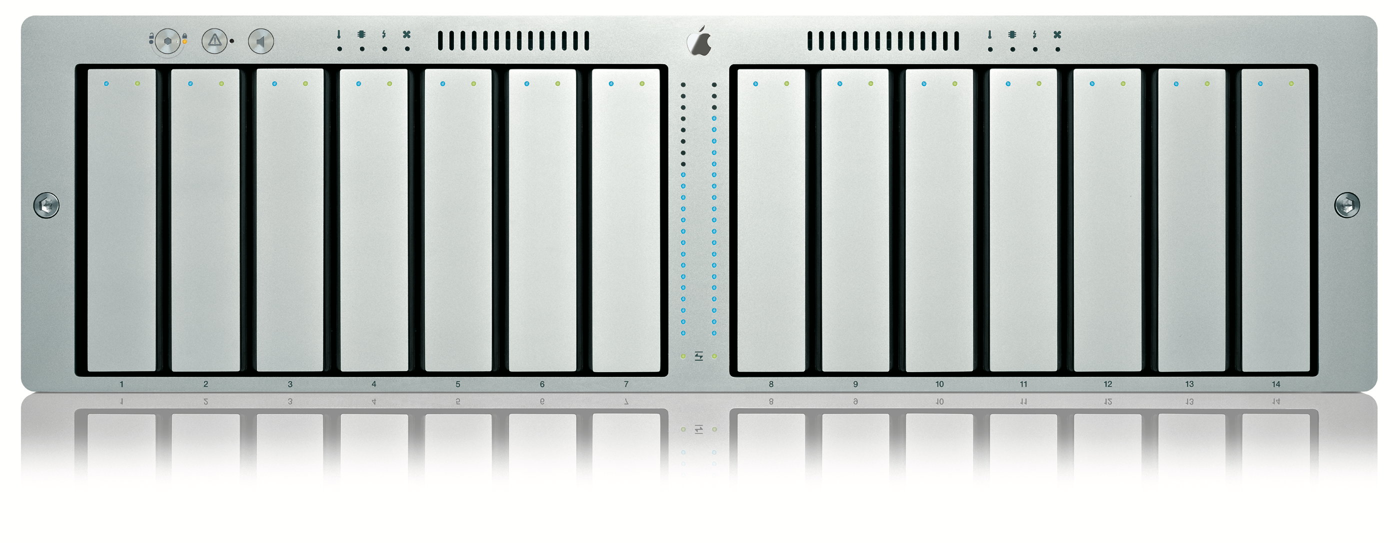 Dans le même temps, Apple avait présenté un système de stockage destiné à accompagner le serveur : le Xserve RAID. De quoi stocker jusqu’à 3.5 Tb de données réparties sur 14 disques durs à la norme ATA/100, ou grimper à plus de 200 Mbits/s en RAID. À l’époque, ça faisait rêver, pour seulement 10,999 dollars pour la version la mieux équipée.