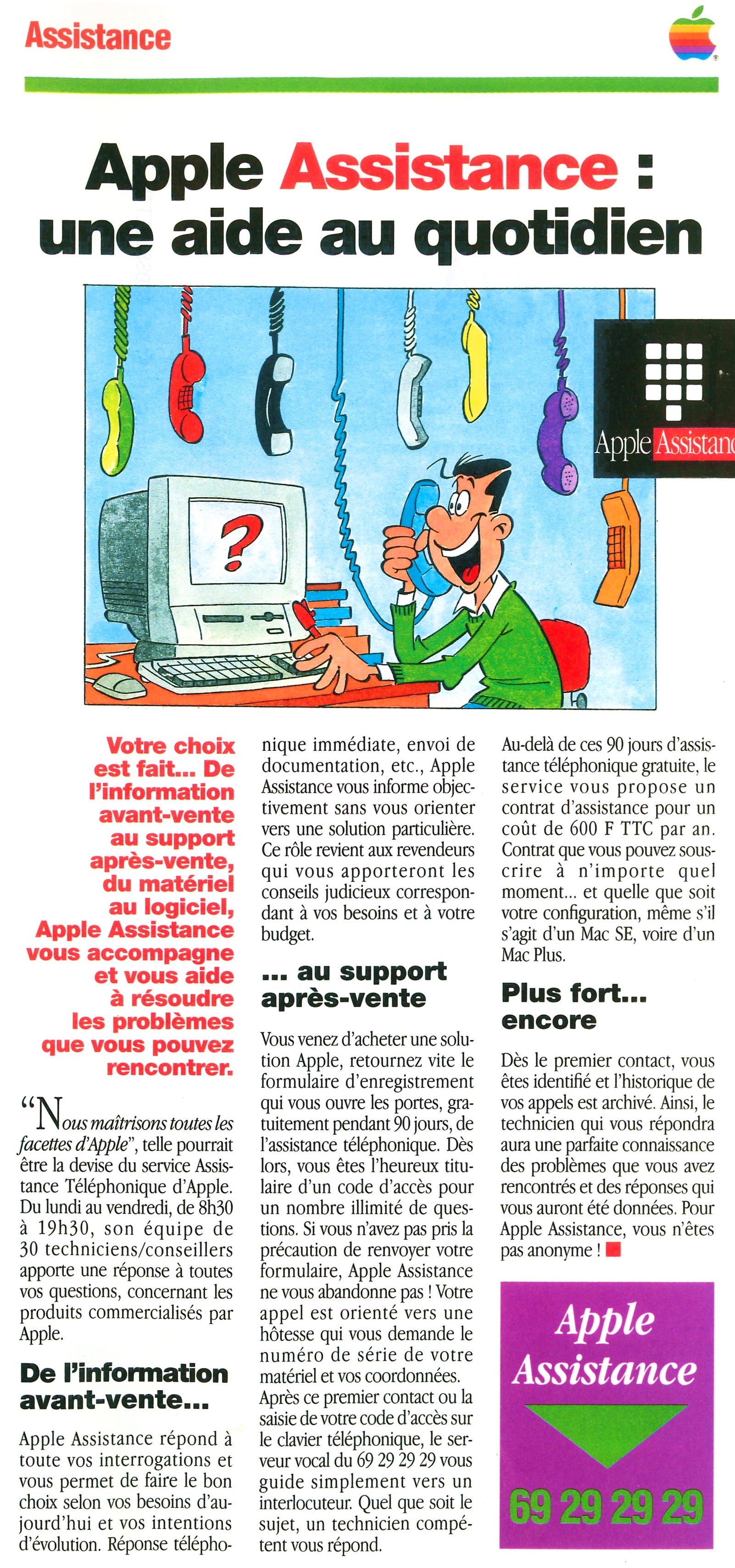 Connaissez-vous Apple Assistance ? Dans les années 90, c’était ainsi qu’on appelait la ligne téléphonique d’assistance aux utilisateurs de la marque à la pomme. Le service est aujourd’hui inclus dans les offres AppleCare. À l’époque, Apple Assistance était accessible au numéro à huit chiffres 69 29 29 29, gratuitement durant 90 jours puis pour un coût de 600 francs (environ 91 euros) par an. D’après cet article issu d’un magazine Apple News de 1994, les trente techniciens/conseillers composant ce service maîtrisaient « toutes les facettes d’Apple »