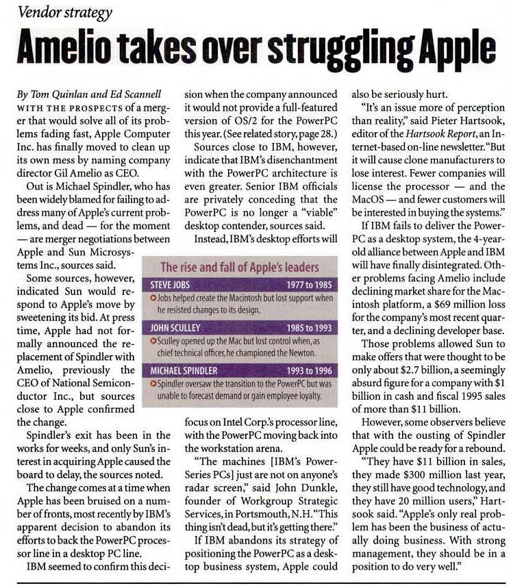Voici par exemple un article extrait de la revue InfoWorld du 5 février 1996. C’est le moment où Gil Amelio, qui faisait déjà partie du Conseil d’Administration de la marque depuis 1994, en prend la tête en remplacement de Michael Spindler. Quand les journalistes écrivent leur article, cette décision n’est pas encore officielle, mais c’est un secret de polichinelle.