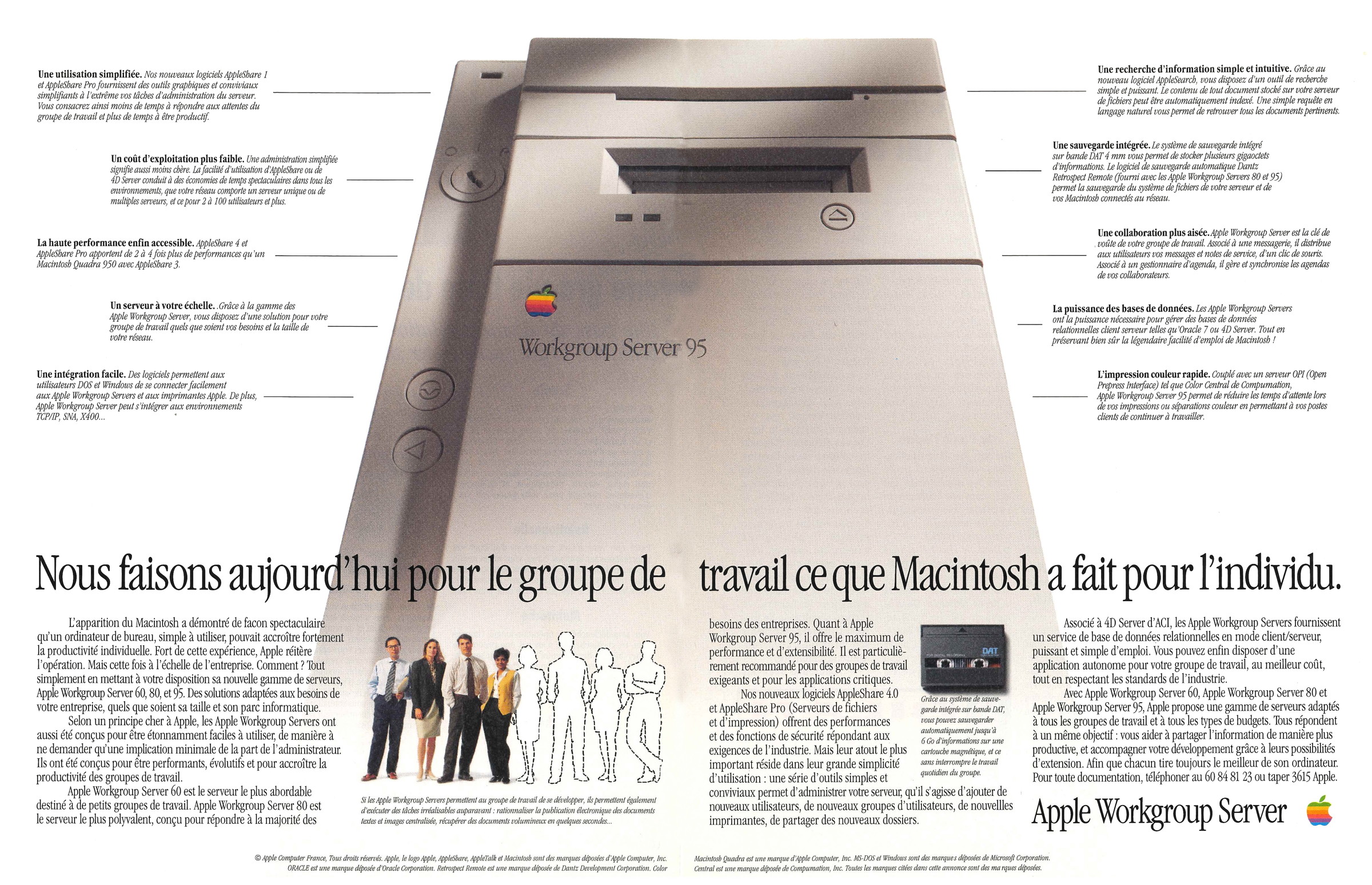 Le dimanche, c’est publicité ! Aujourd’hui, nous vous présentons une double-page publiée par Apple France en 1993. À l’honneur, le Workgroup Server 95, un Macintosh d’un genre un peu particulier, dédié à la fonction de serveur : partage de fichiers et d’imprimantes, messagerie électronique, agenda partagé, bases de données 4D ou Oracle 7, sans oublier la sauvegarde sur bande DAT 4mm. Bref, de quoi faire pour le groupe de travail ce que Macintosh a fait pour l’individu. Tout ça grâce aux logiciels AppleShare Pro et AppleShare 4.