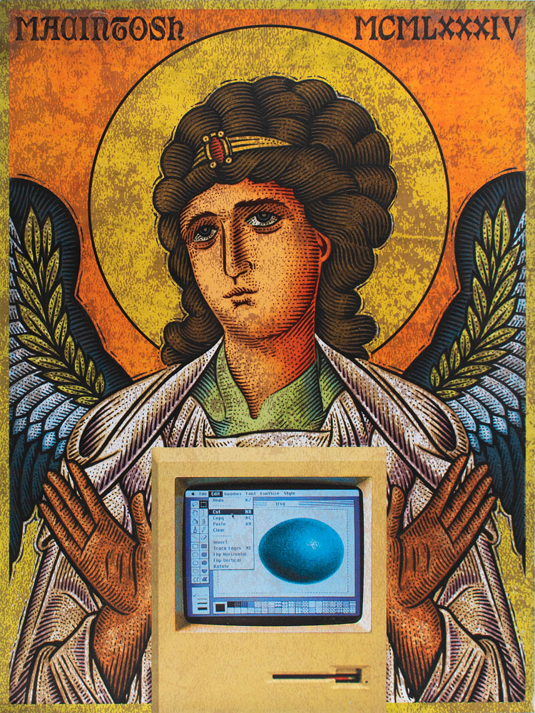 Voilà un bien étrange poster, vendu récemment par RRauction. Issu de la collection d’un salarié non identifié de la marque, ce rare poster promotionnel Apple de 1984 (46 × 61 cm) représente l’archange Gabriel présentant le Macintosh 128K, avec à l’écran un exemple de MacPaint. Dans les coins supérieurs figure l’inscription « Macintosh » et « MCMLXXXIV », rappelant l’année du lancement. Ce visuel artistique est sans doute l’un des emblèmes les plus singuliers de la communication autour du premier Mac.